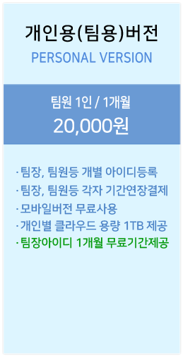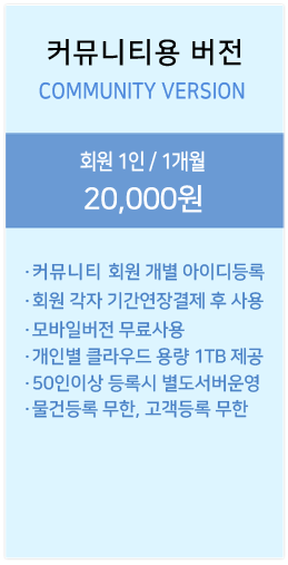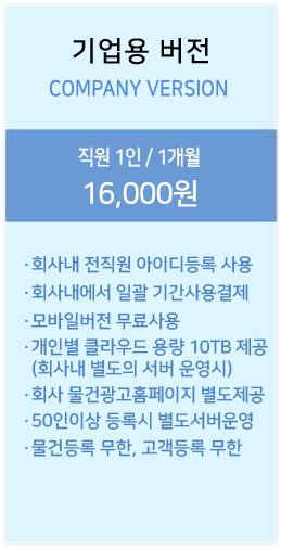 - 규모가 큰 (50인 이상) 회사의 경우 회사 전담서버를 별도로 운영해야 합니다. (매월 10만원소요)